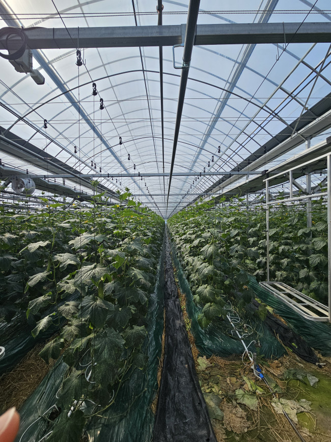 상주시 소재 1,200평 오이하우스는 2중으로 필름이 피복된 하우스로 바깥쪽 1중에는 스카이코트5의 산란광PO필름, 카게나시5를, 안쪽 2중에는 스카이코트5의 투명PO필름, 코팅5+1을 피복하셨습니다.